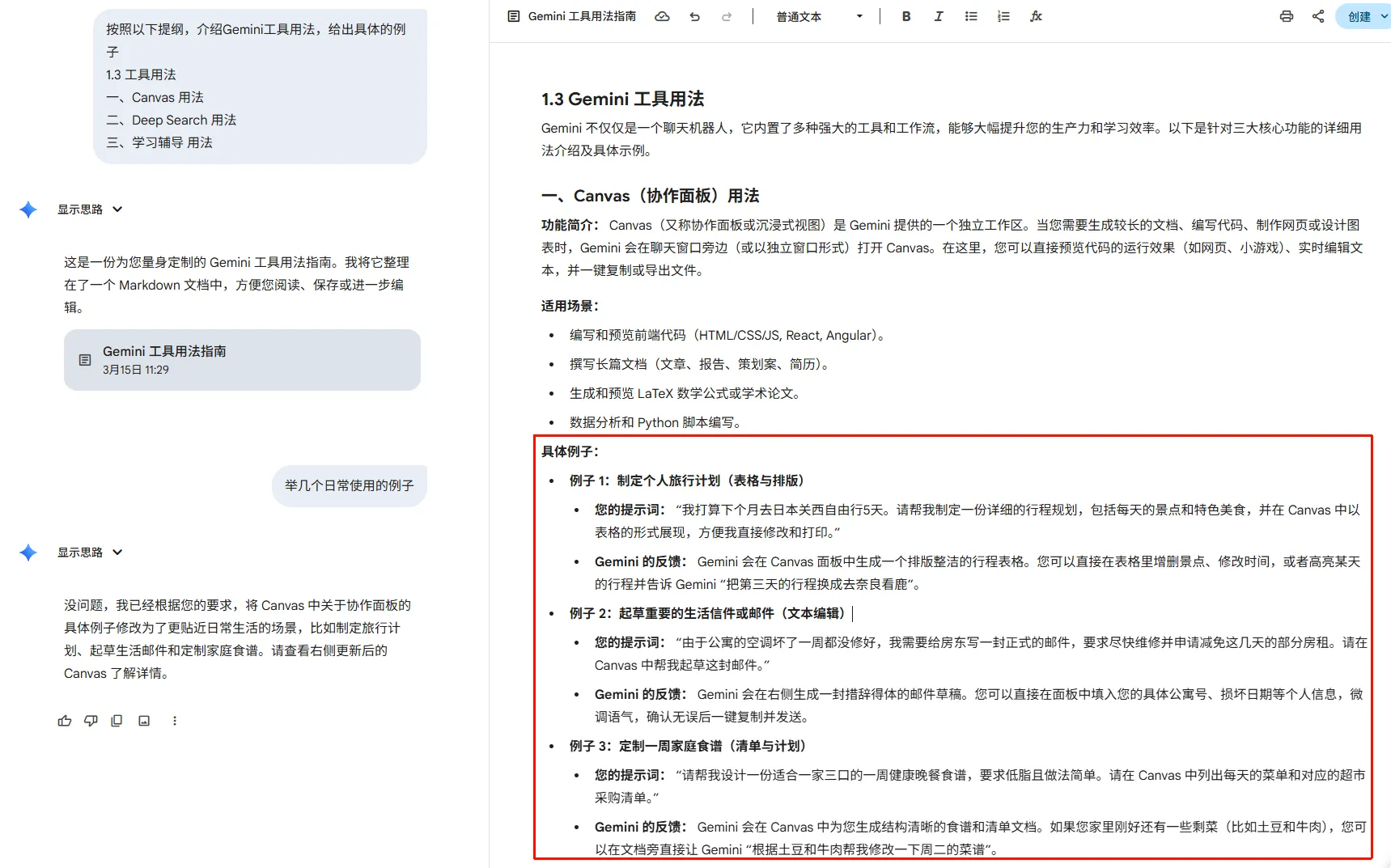 - Gemini 的反馈: Gemini 会在右侧面板生成结构清晰的提纲文档。您可以直接在面板中修改标题、增删段落,完成后一键导出为 Markdown 或文本文件。